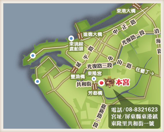 ⊙(開車)經高雄>>88快速道路>>經萬丹/東港 交流道>>下交流道右轉>>直走15分鐘到底順著路左轉至東港大橋